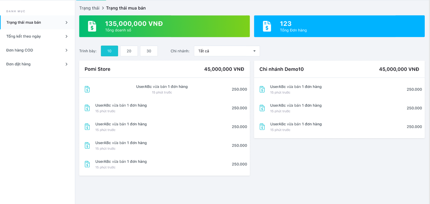 - Tổng kết đơn bán, đơn đặt hàng trong ngày