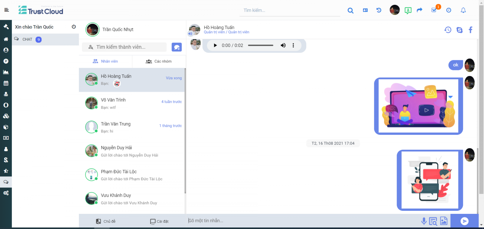 - Phần mềm chat trực tuyến tích hợp ngay trong EtrustCloud xCRM giúp các nhân viên hay quản lý dễ dàng giao tiếp với nhau, nội dung hoàn toàn bảo mật không cần phải cài phần mềm giao tiếp của bên thứ ba.
