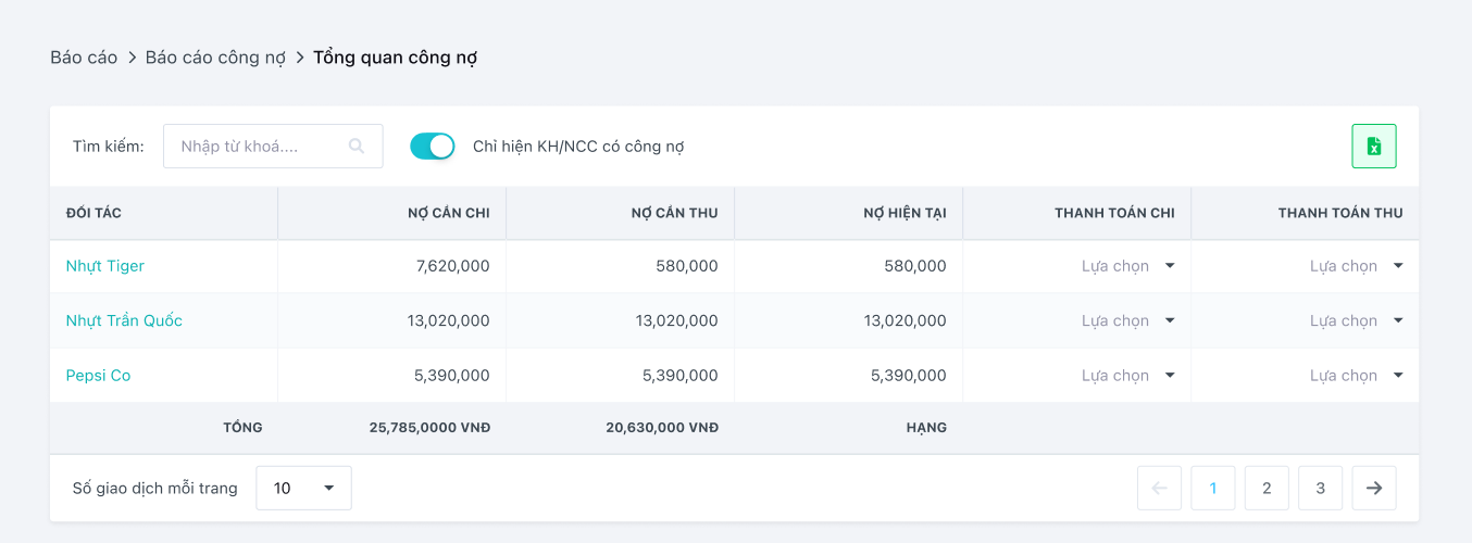 - Tổng quát tất cả các công nợ bao gồm của nhà cung cấp và của khách hàng