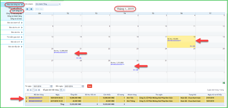 - Xem lịch công nợ theo tháng, theo chi nhánh