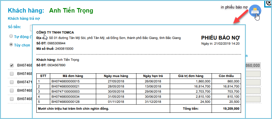 - Xem thông tin công nợ của khách hàng