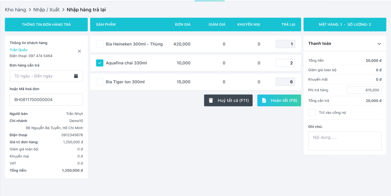 - Nhập đơn trả theo hóa đơn bán/nhập hàng hoặc thông tin khách hàng, thông tin nhà cung cấp