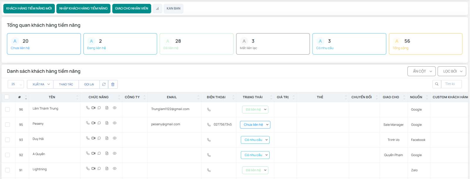 - Quy định trạng thái để phân loại khách hàng tiềm năng.