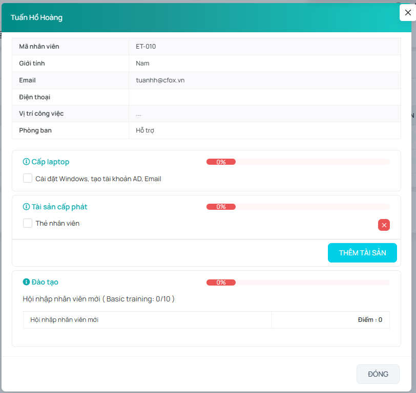 Quản lý quy trình tiếp đón, đào tạo và nghỉ việc của nhân viên