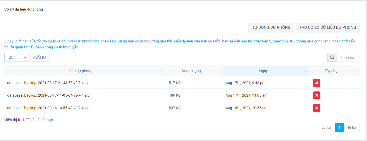 - Tự động sao lưu cơ sở dữ liệu dự phòng theo thời gian xác định.