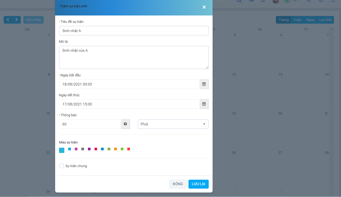 - Cho phép tạo sự kiện thông báo trên trên lịch.